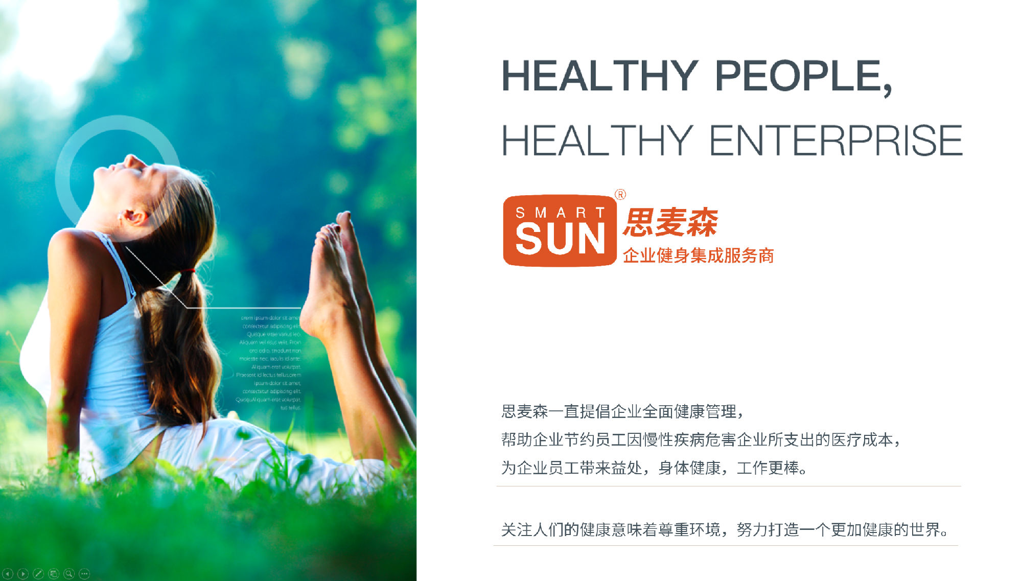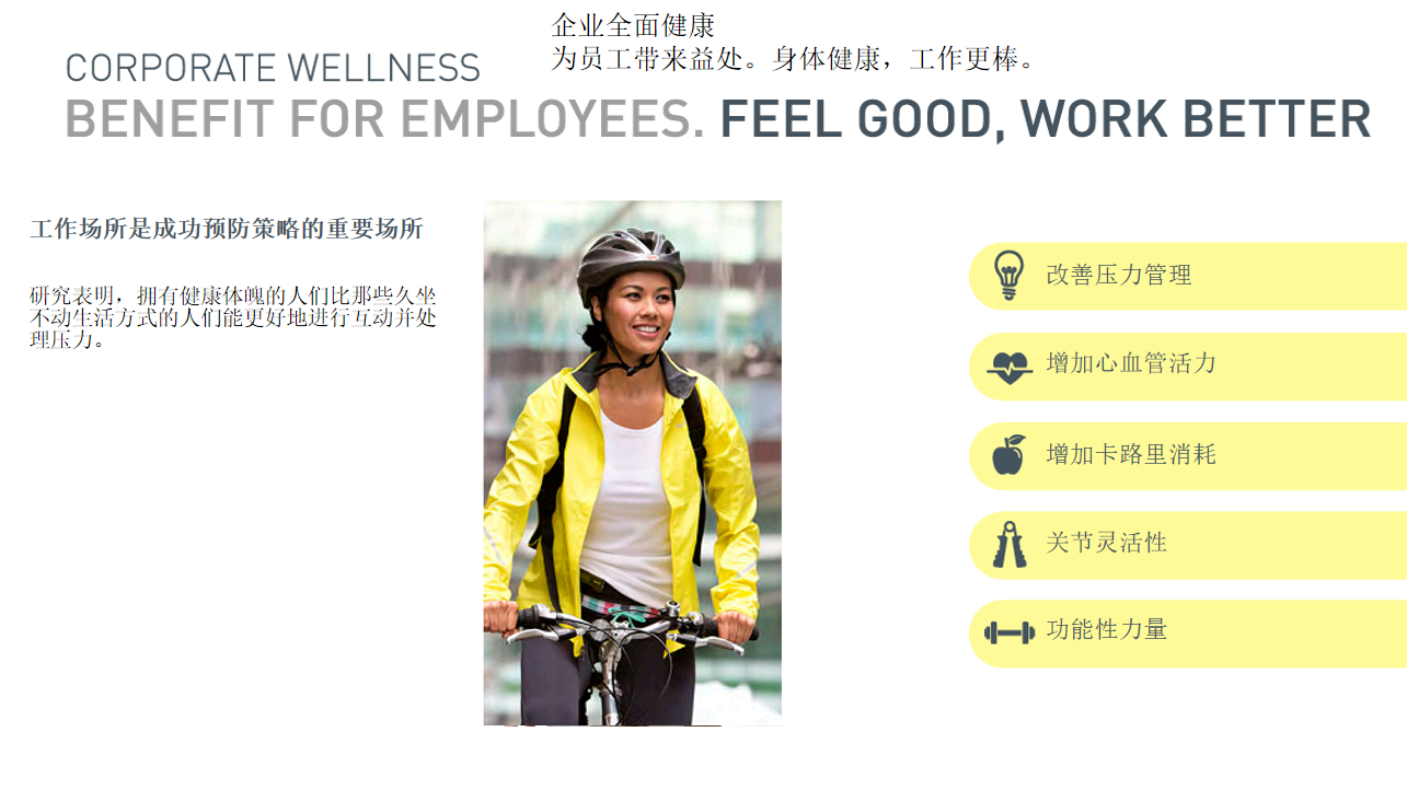 Our company has a professional enterprise fitness center operation∑ and wellness & health consulting service management team, We also have senior♠ expertsfrom various related fields, to meet customer 'needs, provide corporate wellnessand quality fitness health services. Smartsun, regard creating enterprise harmoniousatmosphere and provi€ding customers with comprehensive solution as theenterprise core driving f☆orce. Every company bear the social responsibilities, take responsibility for own employees, surrounding communities and environment. As a company advocating Wellness lifestyle, Smartsun is devote to build auniquehigh-end service image with sound≥quality management system and excellent professional team.